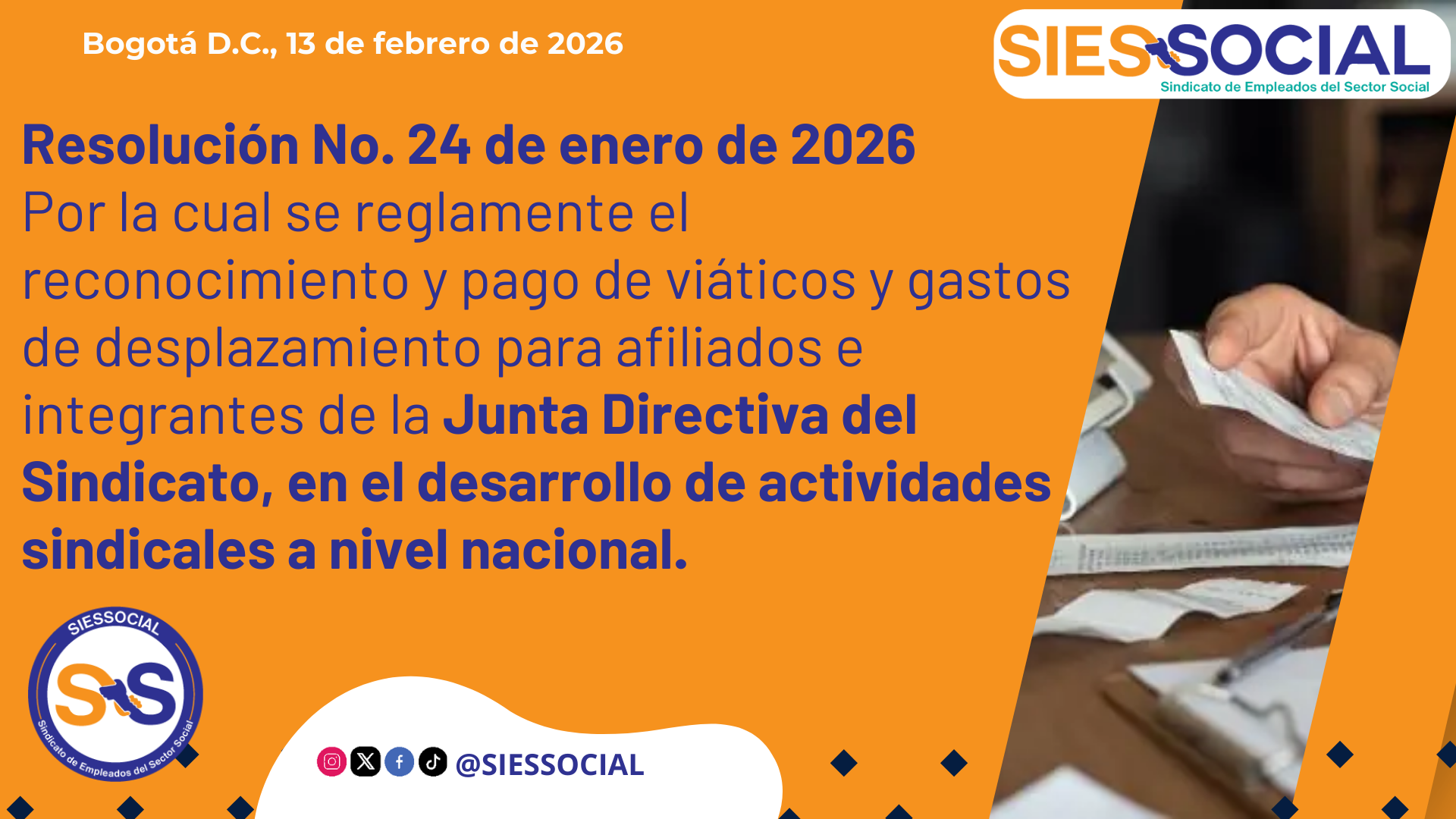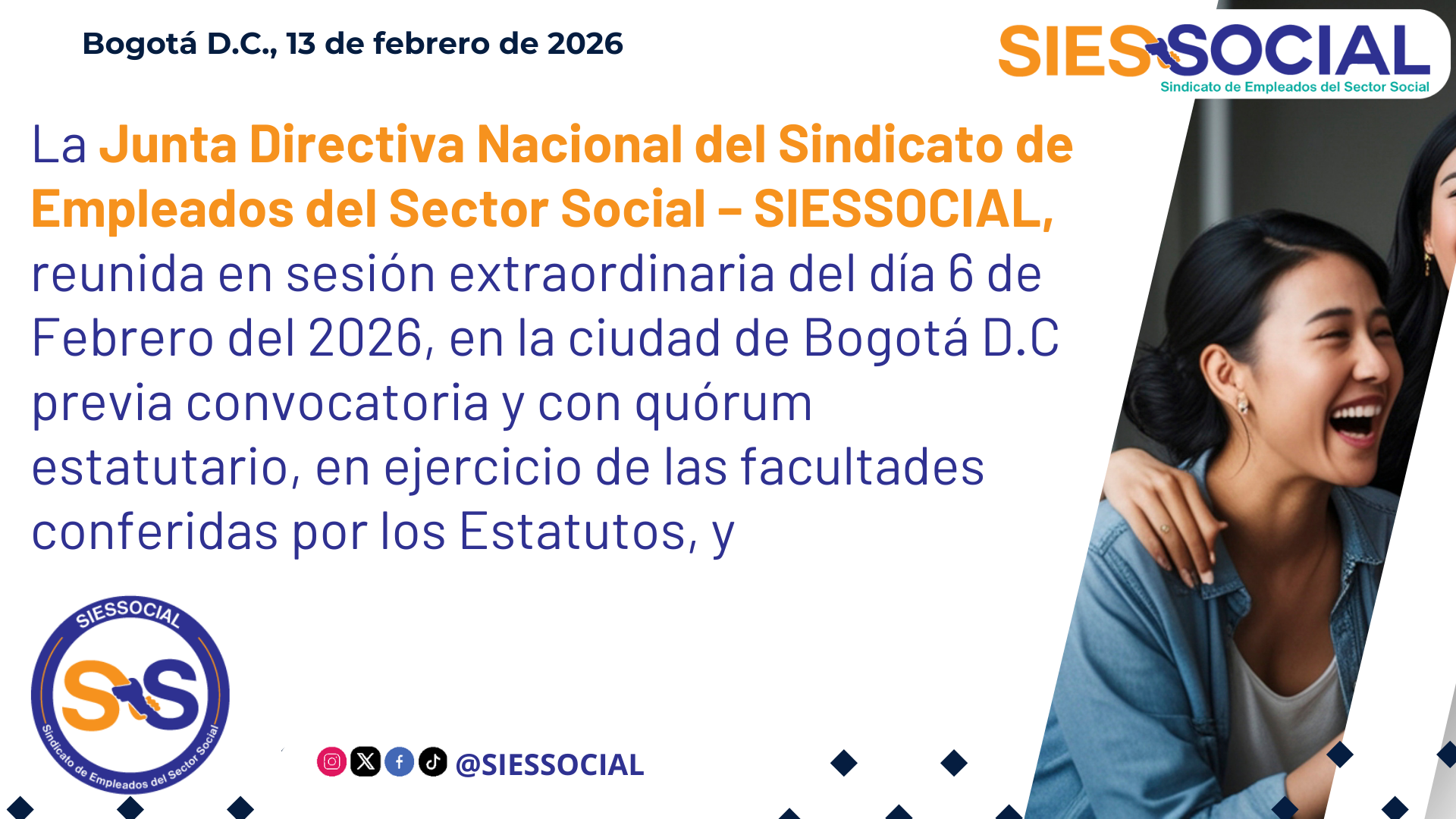 La Junta Directiva Nacional del Sindicato de Empleados del Sector Social – SIESSOCIAL, reunida en sesión extraordinaria del día 6 de Febrero del 2026, en la ciudad de Bogotá D.C previa convocatoria y con quórum estatutario, en ejercicio de las facultades conferidas por los Estatutos, y Leer más